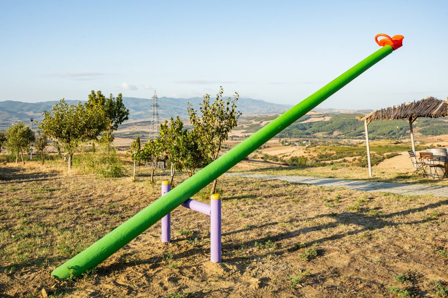 Through the seesaw designed for Barbare Vineyards, Cengiz Tekin attempts to interpret nature’s balance through an unnatural situation. Since the object is stuck in the ground and cannot move up or down, it presents a structure that is disconnected from its purpose, unbalanced, and uncoordinated. It now resembles more a sculpture than a seesaw. The vibrant colors of the seesaw evoke the playfulness of a children’s park while also referencing the site-specific map the vineyard uses to differentiate grape varieties. Through the sculpture, the artist expresses the loss of natural balance by disrupting the function of a toy based on equilibrium.
