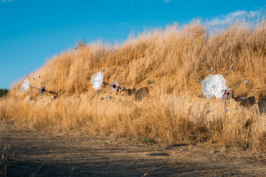 For Barbare Vineyards, Nicholson incorporates sculpture into his practice for the first time. While the thickness and depth in his paintings approach three dimensions, the structures in the landscape merge in the artist’s mind and form an installation. He creates a world with familiar yet tenuous objects. The functions of parts oscillating between a piece of machinery, an inter-dimensionally invasive plant species, or a shrine are ambiguous. The capacities and limits of the local materials he uses (machinery parts, construction iron, thread and textiles) guide the artist as he realizes his works. During the production process, the inevitable communication he establishes with the Barbare landscape, the wild grasses moving with the wind, and large-seeded plants are unknowingly incorporated. The shapes, strings and patterns on the work render the sculpture more empathetic and accessible; on the other hand, these details are like parts of an unknown ritual. The artist’s aim is not to be overly dogmatic but to provide an entry point for people to feel a sense of connectivity and nostalgia for a universally shared experience, enticing them to engage with and question the world we live in and the structures we have put in place.
