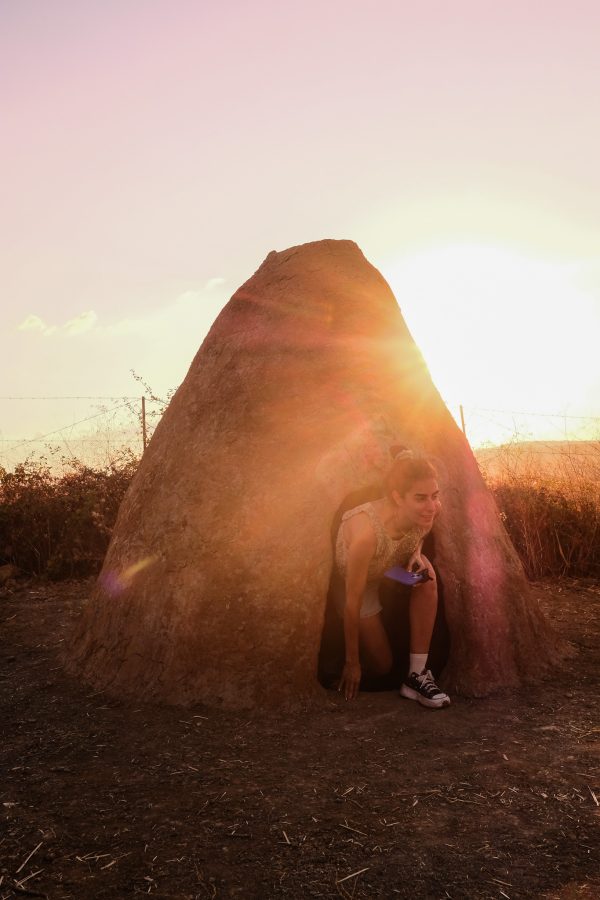 In this particular piece, Mother’s Womb , Dilan Bozer attempts to interpret her personal narrative through the lens of collective mythology. Drawing inspiration from the cultural heritage of tumulus structures in the region, she crafts her work from stone, soil, and clay. Though it appears as a mound from a distance, it represents the navel of the land. Tumulus structures are typically known as monumental burial sites, holding the body and objects that define an individual’s life. However, they also symbolize more than just the physical end of life; they embody a belief in the possibility of rebirth and the emergence of a new life form. They remind us that every individual’s journey begins in the mother’s womb and returns to the greater womb of the earth. Harvesting wild clay formed over thousands of years by the ancient seas and layers of sediment, the structure’s particles contain the region’s geological history. The artist conveys the cycles of life through the metaphor of the womb that shapes and defines life. By working directly with this temporal material, the artist finds a way to communicate with the accumulated memory of past and present civilizations and listen to the story of the land. Inviting viewers into the structure to share this experience, she borrows the landscape from the viewers’ sight and proposes perceiving the landscape through senses such as intuition, sound, smell, or touch, embedded within the womb of the earth.